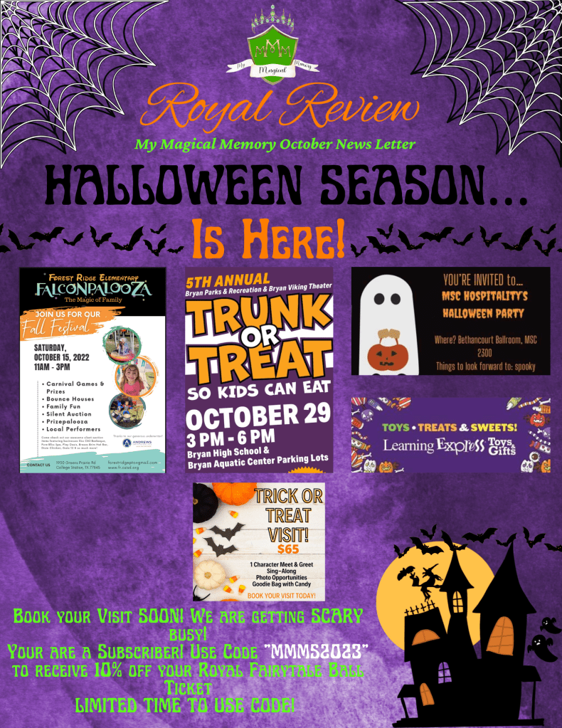 We are SPOOKY everywhere this holiday season! We want to let you know where we are going to be this Spooky Season! Plus, its October 1 and TICKET SALES GO LIVE TODAY for the Royal Fairytale Ball! As a subscriber, this month ONLY you receive 10% off with code “MMMS2023”!