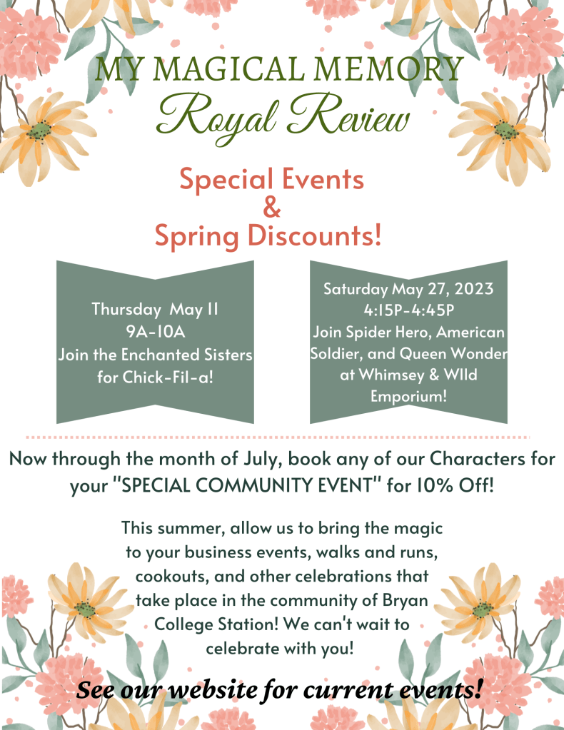 April Showers Bring May Events! May 8, 2023 My Magical Memory - Character Parties & Events Share this: Click to share on X (Opens in new window) X Click to share on Facebook (Opens in new window) Facebook Like Loading... Related Published by My Magical Memory - Character Parties & Events View all posts by My Magical Memory - Character Parties & Events