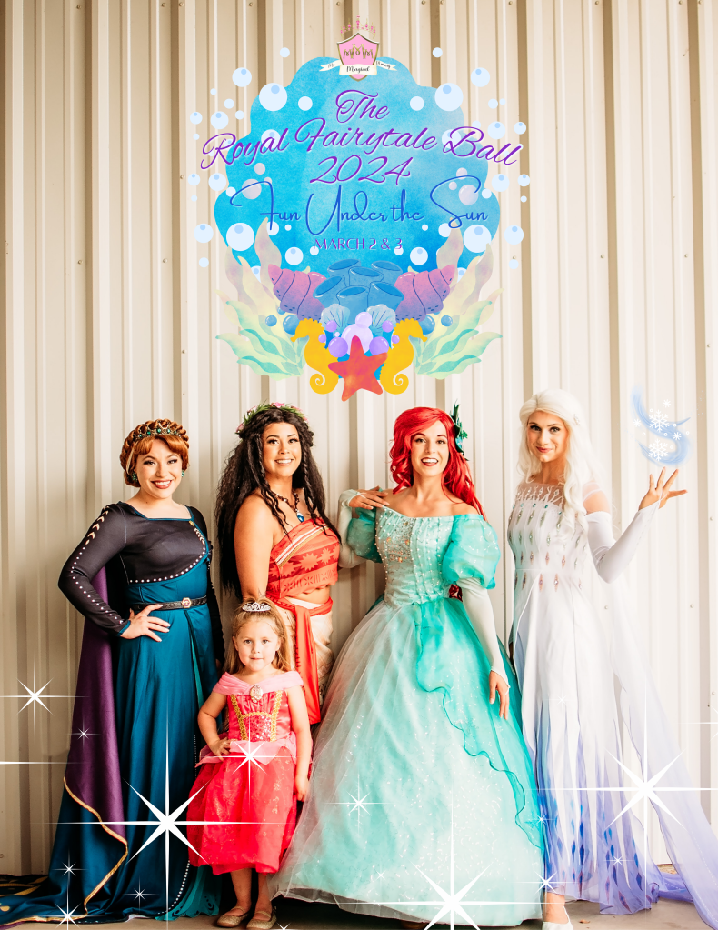 Behold, a wondrous realm awaits, where families gather to partake in a feast of delights. Small finger foods, treats, and a candy bar shall grace the halls, and each soul shall savor a bounty of beverages. Venture forth to Rapunzel’s Tower, where face painting and a clue to the MAGICAL TREASURE HUNT await. Let the Royal Superhero Academy enchant you with their games and activities, hosted by our Enchanted Sisters and Superhero school. Take respite from the festivities at the Gardens Gazebo, where Cinderella, Beauty Princess, and Snow Sisters regale you with tales and grant wishes. Our Sea Friends, known for their love of family, shall unveil their NEW Under The Sea Grotto, where the Sea Mermaid and Wayfinder Princess beckon you to capture memories in front of one of our three photo opportunities. And lo, our Sea Mermaid shall unveil fin-tastic surprises at this year’s Royal Fairytale Ball. Come, dear ones, and revel in the magic of this celebration, for memories to cherish shall be woven into the tapestry of your hearts.